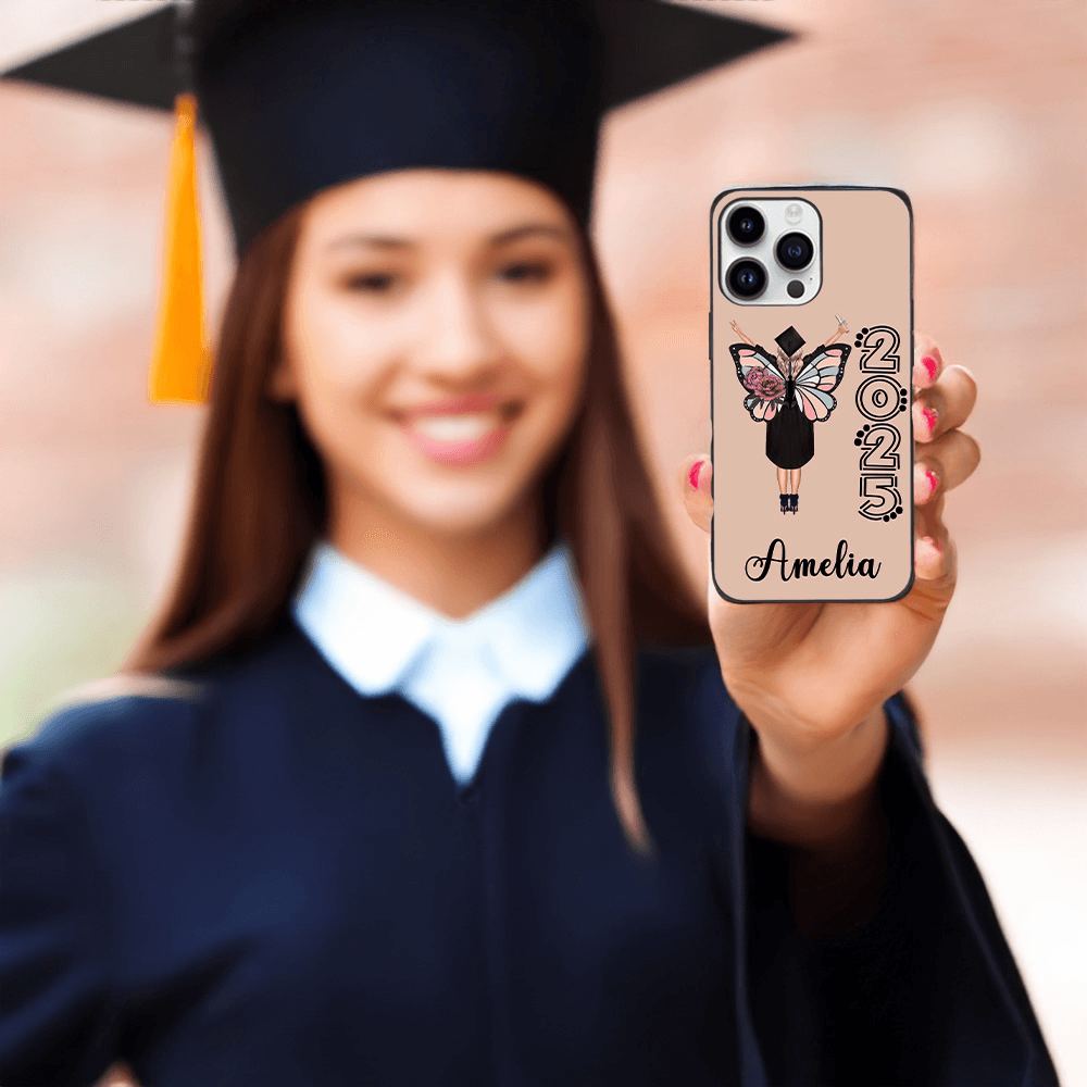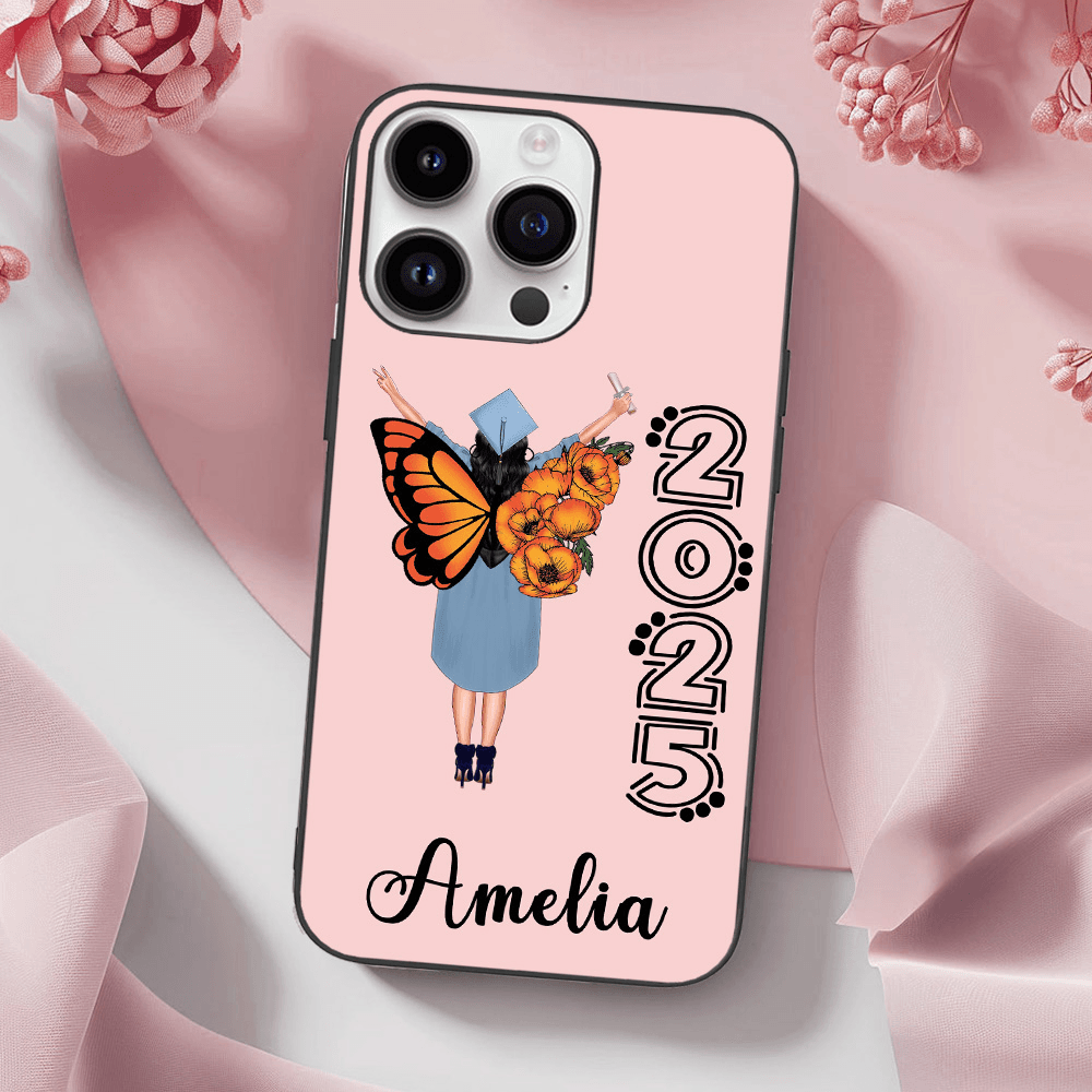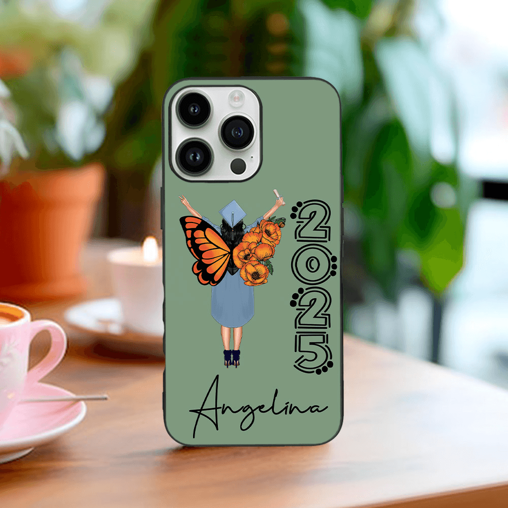 Customizable Design - This phone case can be personalized with a graduate cartoon character. It features a beautiful butterfly design adorned with birth flowers, along with the option to personalize it with a name and year. It’s a unique way to express individuality and style.