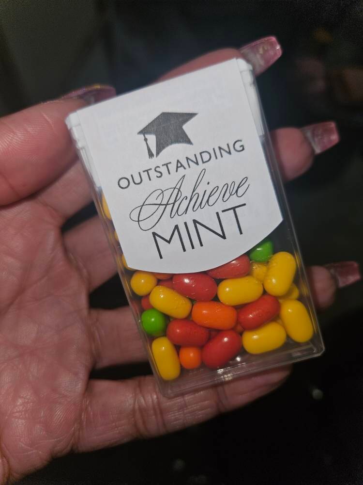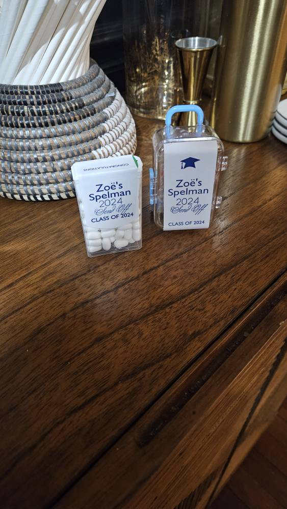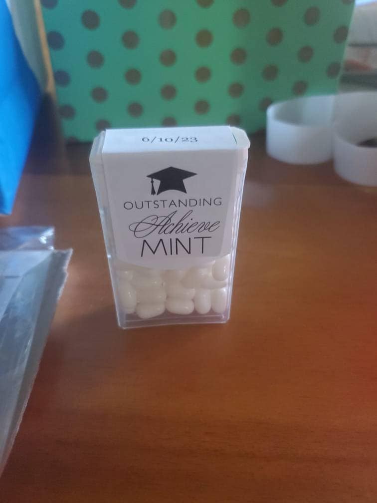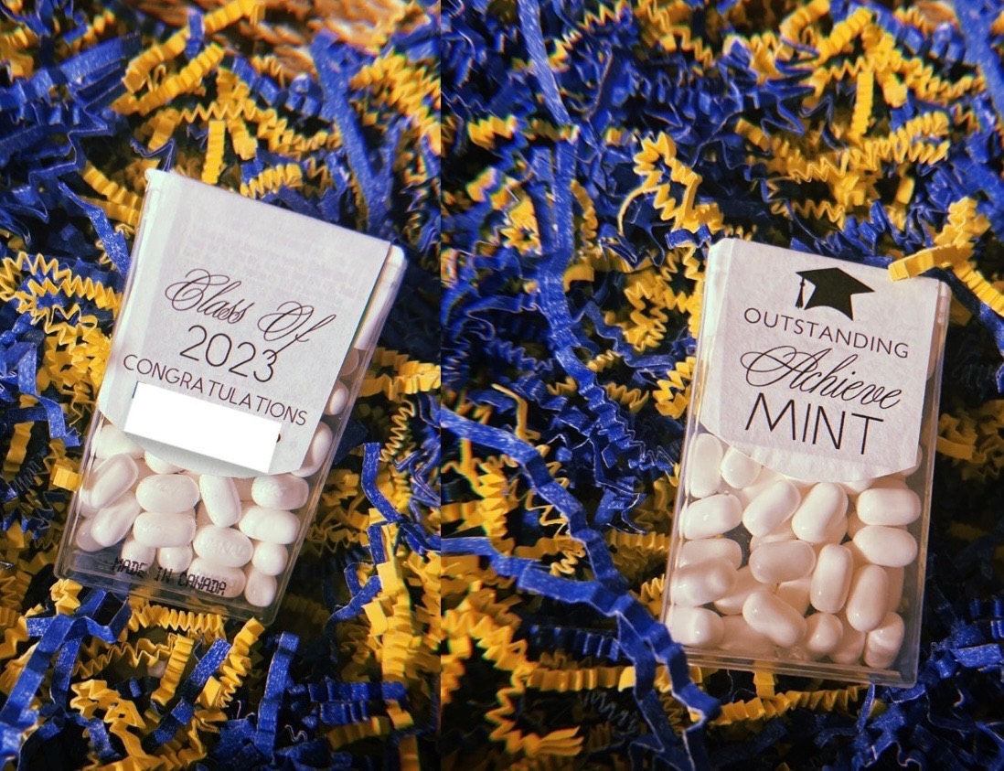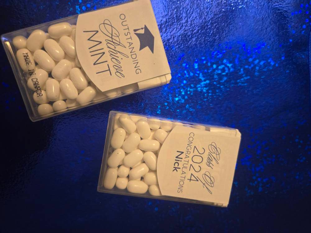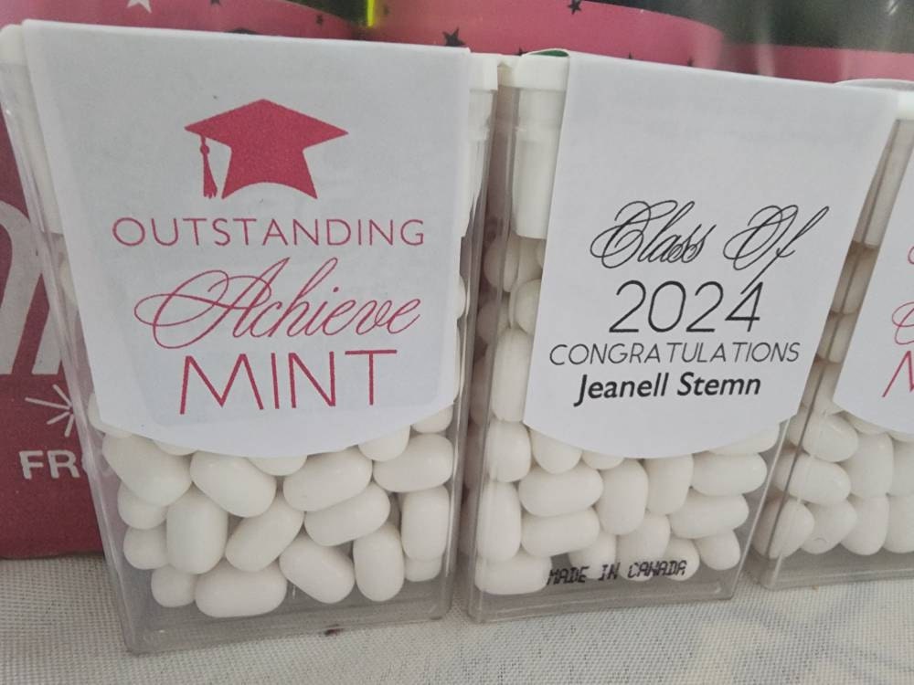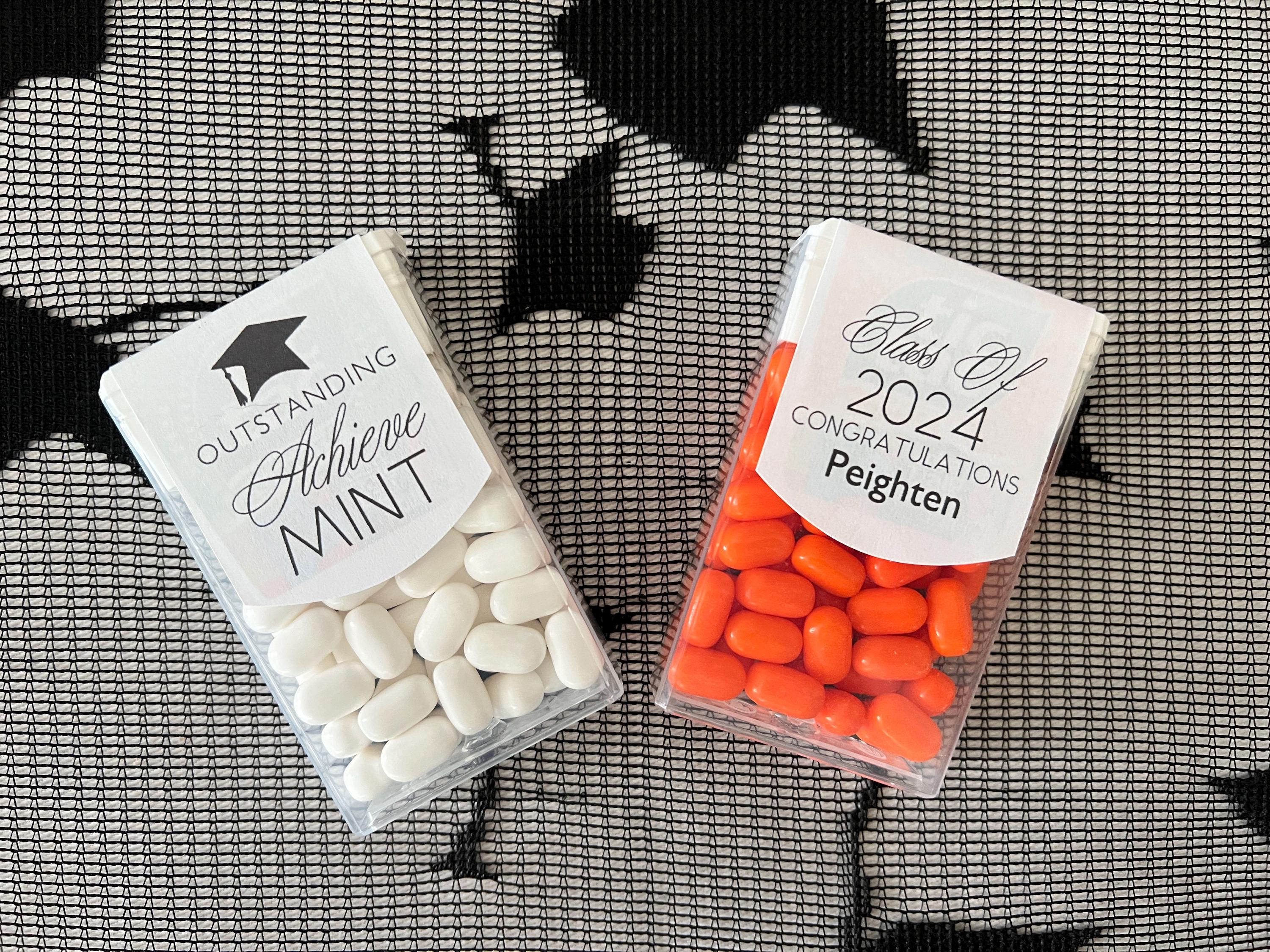 Class of 2025 edible mints would be perfect graduation party favors for your guest to enjoy. These favor sticker labels can be personalized with the graduates name and date on the top and a sweet thank you message on the back. (Mints NOT included, this listing is for the labels only).