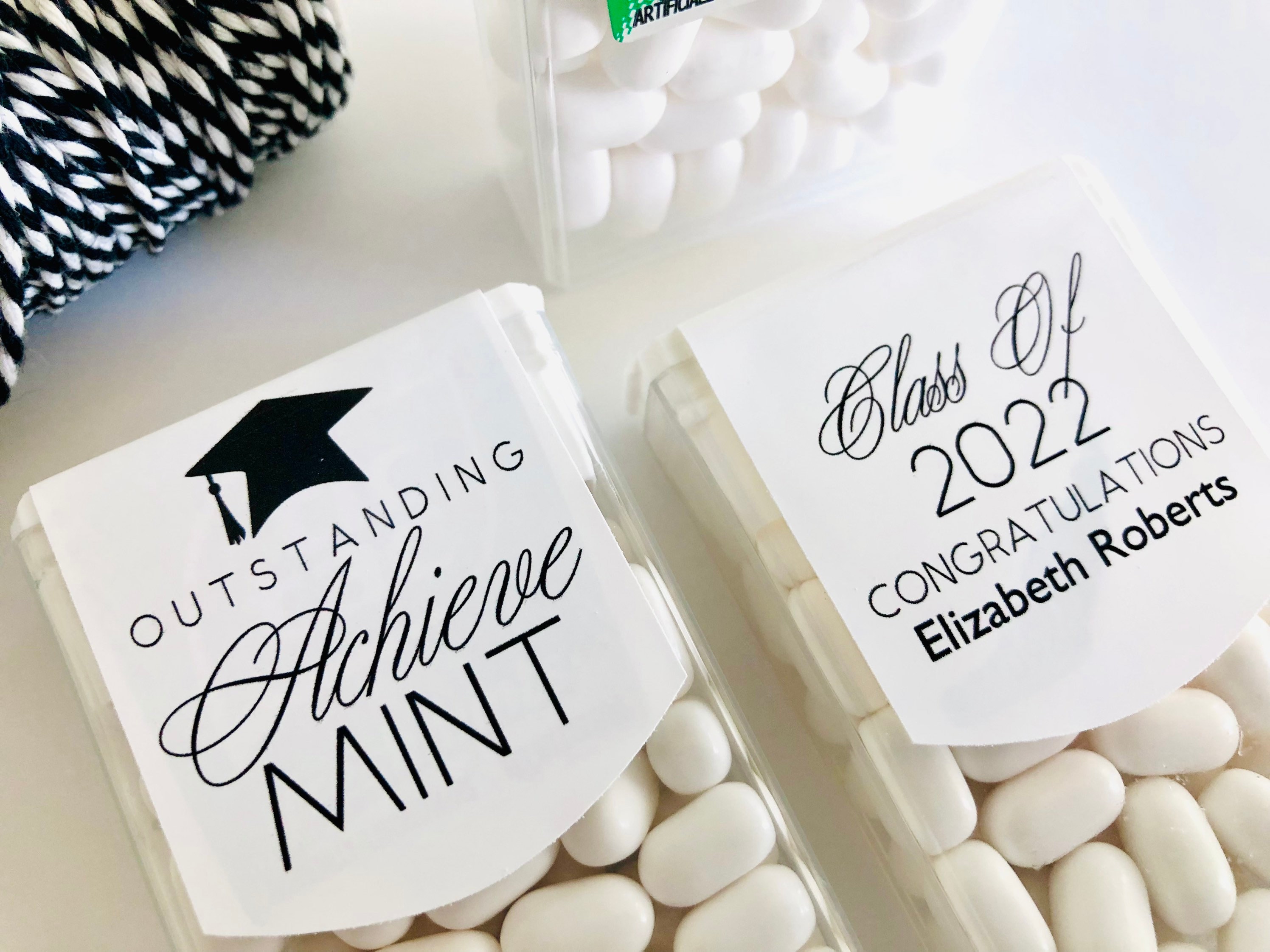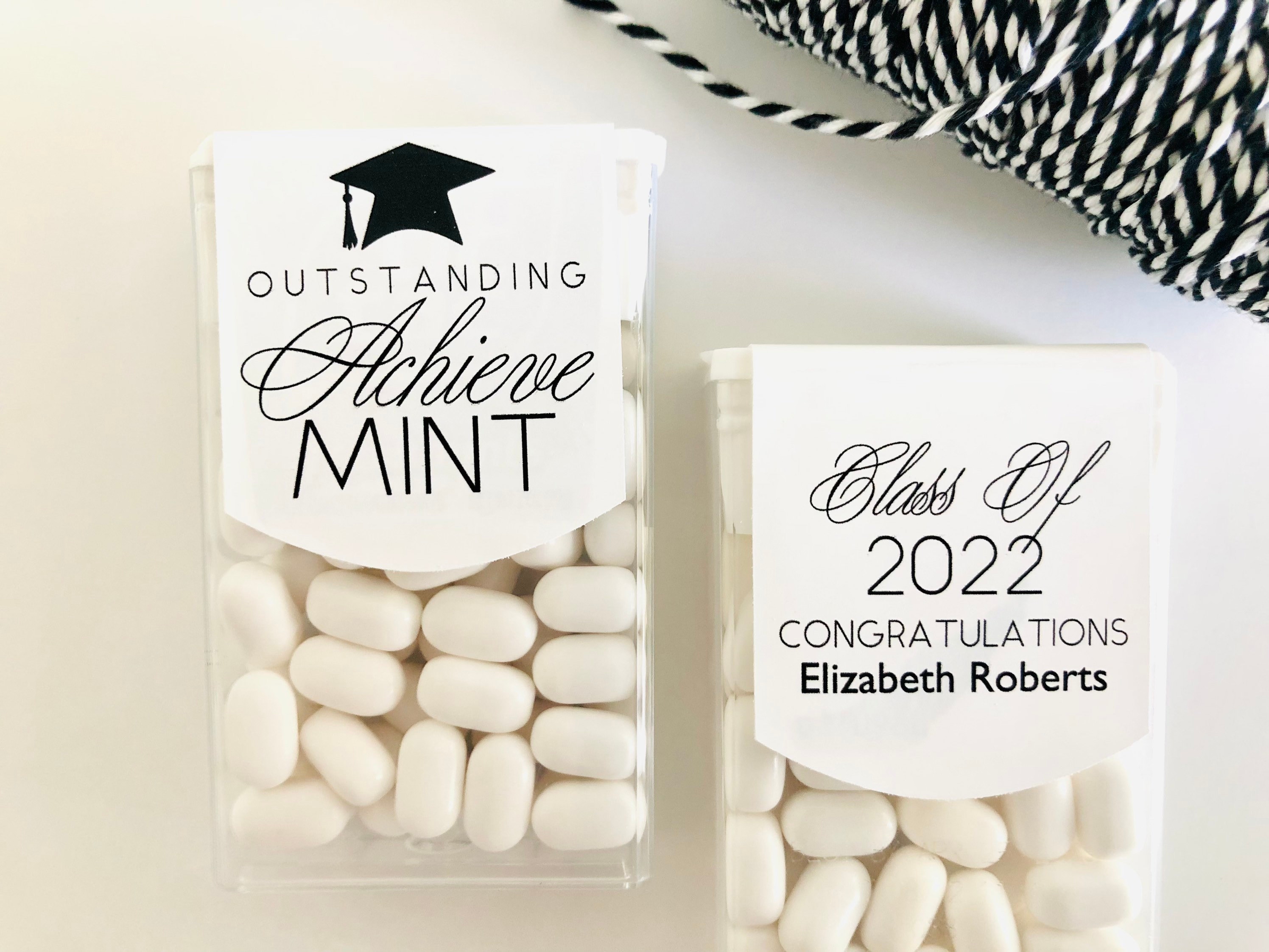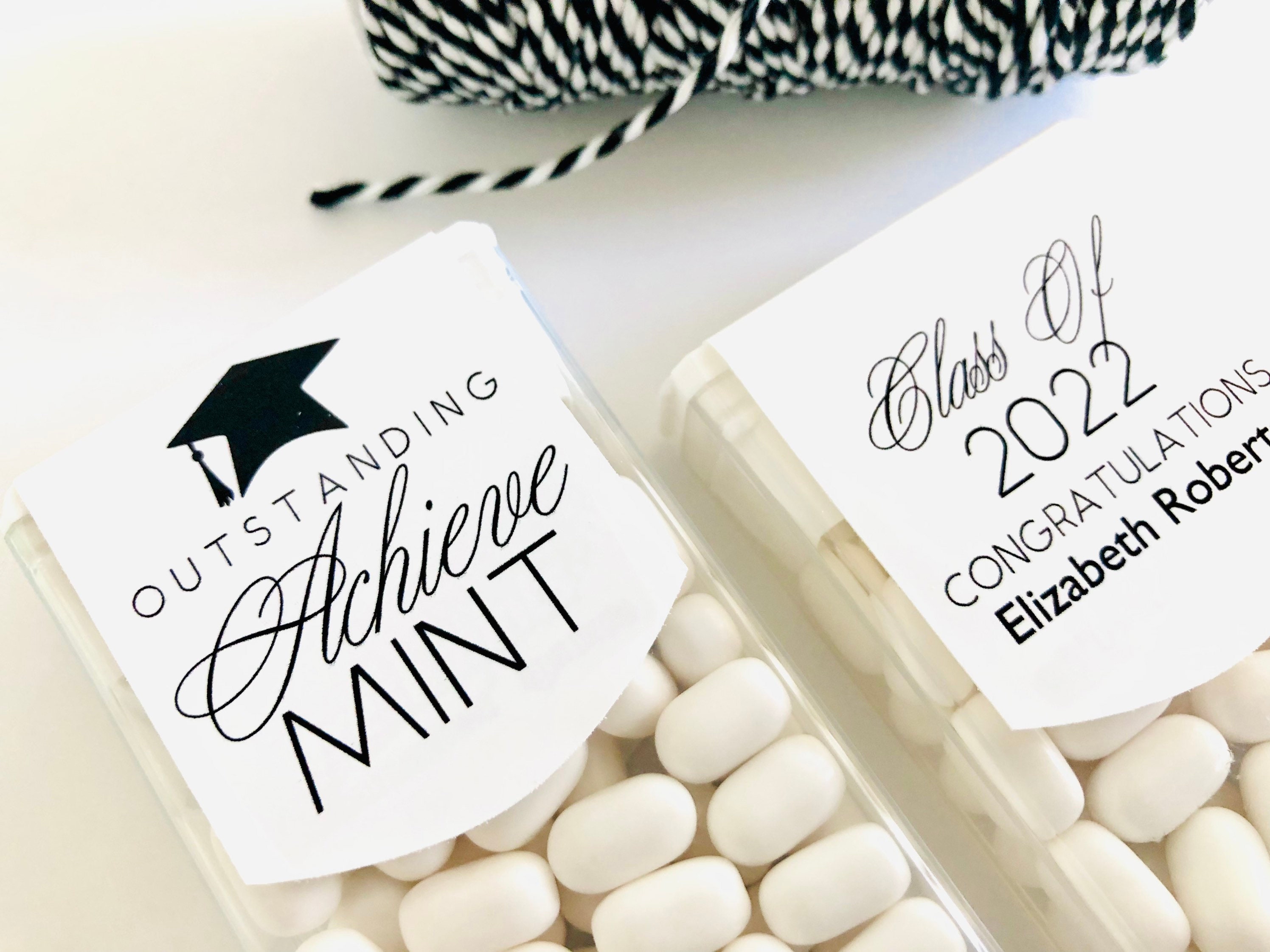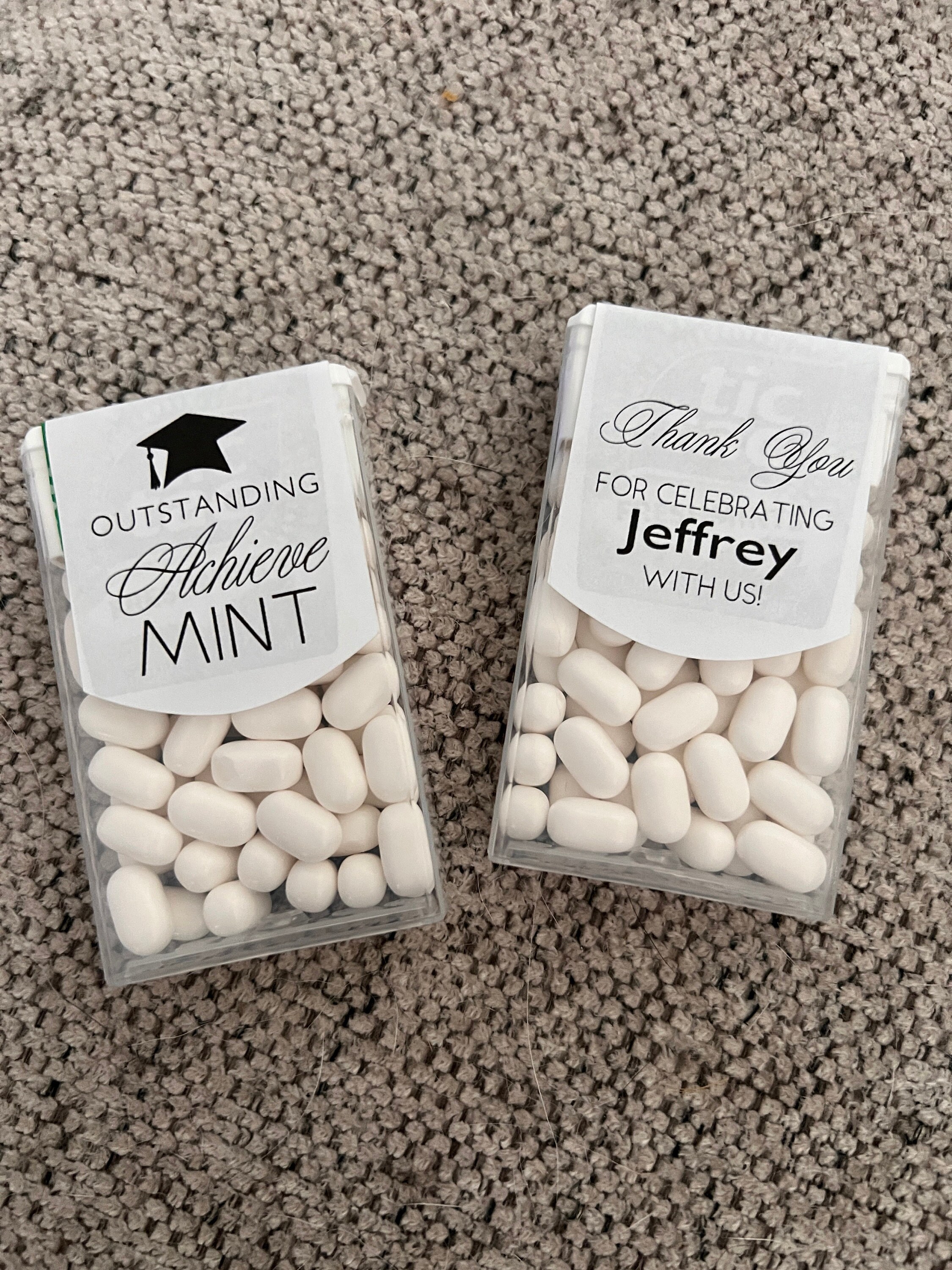 Class of 2025 edible mints would be perfect graduation party favors for your guest to enjoy. These favor sticker labels can be personalized with the graduates name and date on the top and a sweet thank you message on the back. (Mints NOT included, this listing is for the labels only).
