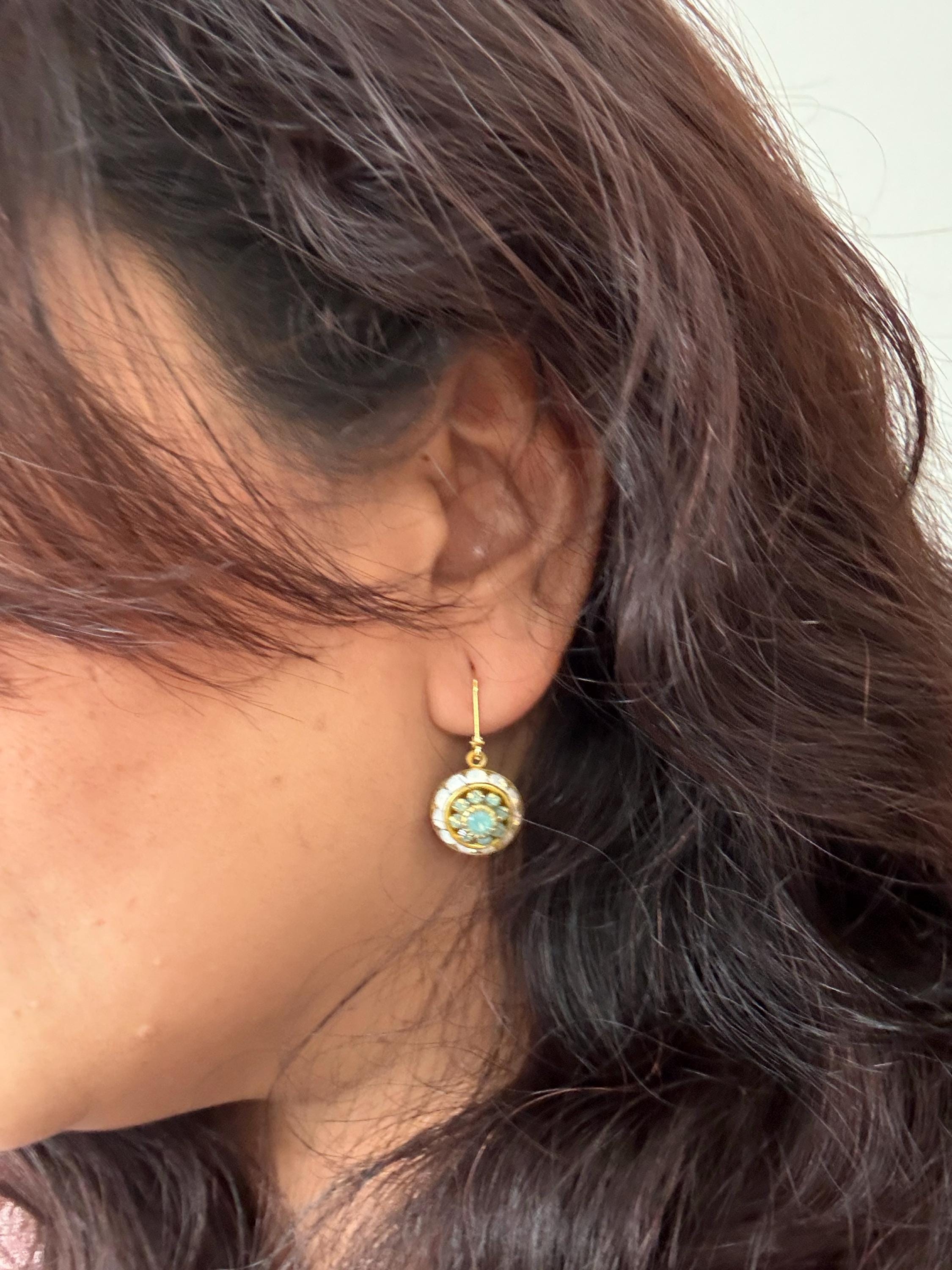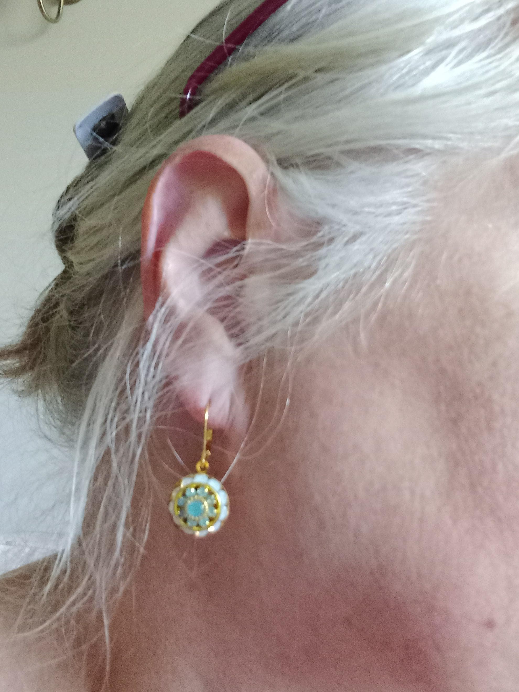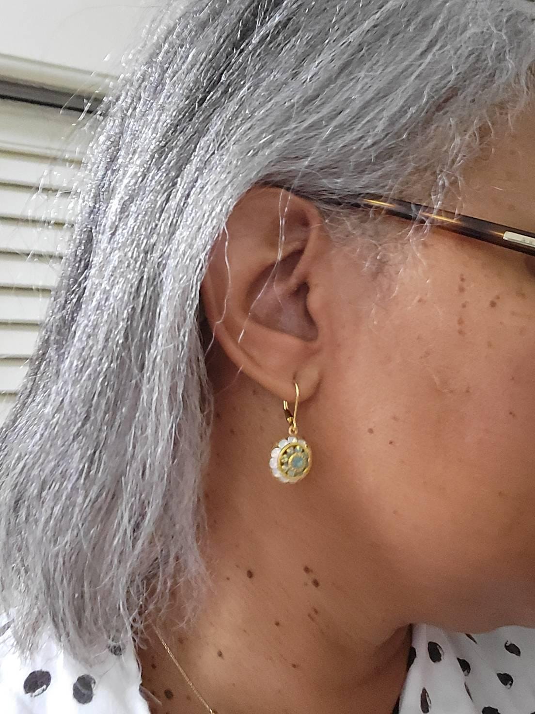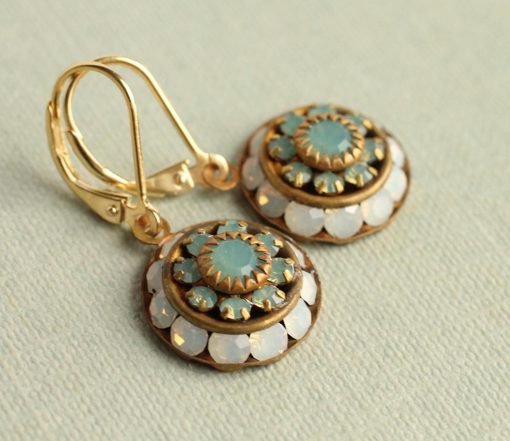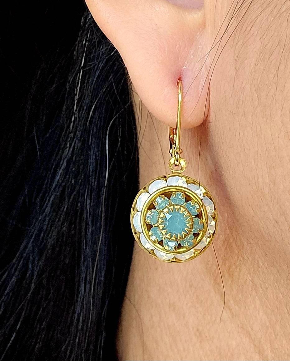 These beautiful jewel earrings are made up of rows of tiny green and white cloudy opal crystal jewels, set carefully into brass to create a stylised circular shape. Each earring is finished with an turquoise opal glass jewel set into the centre. We love the contrast between the deep golden brass and the delicate opal tones.